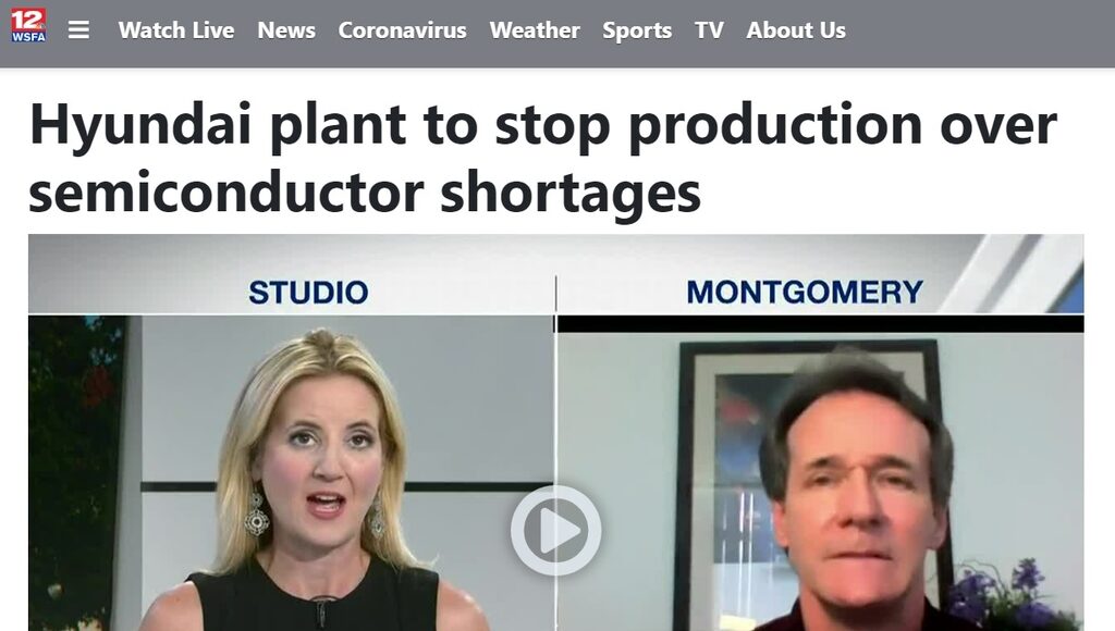 현대자동차 미국 앨라배마 공장이 차량용 반도체 부족으로 14일부터 21일까지 공장 가동을 중단한다. 현대차 앨라배마 공장 로버트 번즈 대변인(오른쪽)이 12일 현지언론 WSFA TV와 인터뷰를 갖고 공장 가동 중단에 관해 설명하고 있다. [출처=WSFA TV 캡처. 재판매 및 DB 금지]