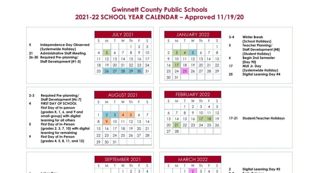 아래는 귀넷카운티 공립학교 2021-2022학년도 달력