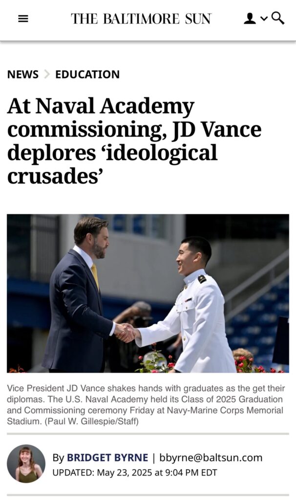 부통령이자 해군 선배로서 연단에 오른 밴스는 며칠 뒤 트럼프 대통령이 미 육군사관학교 졸업식에서 밝힌 것처럼 “미국 군인들을 더이상 미국과 상관없는 남의 나라 전쟁에 보내지 않겠다”고 말했다.