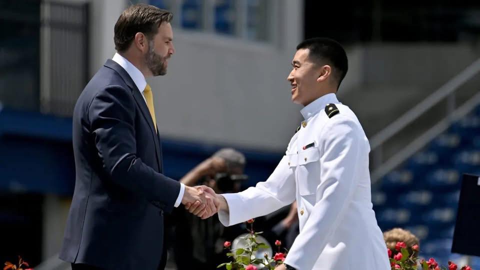 지난 23일 미 해군사관학교 졸업식에서 애틀랜타에서 성장한 대니엘 킴(한국명 김성인) 생도가 1049명의 졸업생 가운데 JD 밴스 부통령과 악수하며 축하를 받았다.