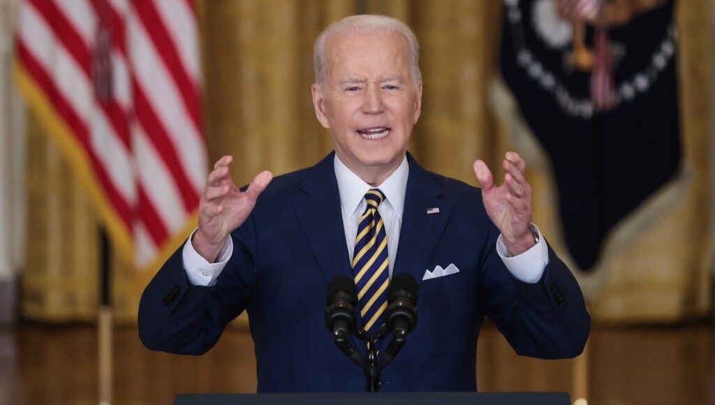 조 바이든 미국 대통령이 취임 1주년을 하루 앞둔 지난 19일(현지시간) 워싱턴DC 백악관 이스트룸에서 기자회견을 하고 있다. 바이든 대통령은 이 자리에서 러시아가 우크라이나를 침공할 경우 책임을 물을 것이라며 초강경 대응을 공언했다.