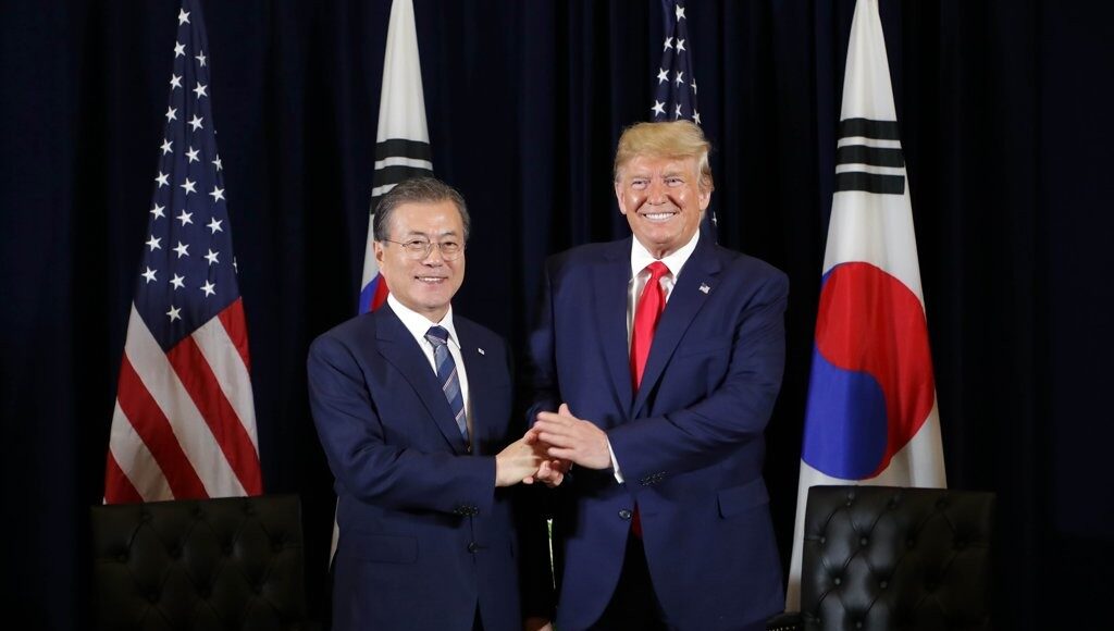 손잡은 한-미 정상문재인 대통령과 도널드 트럼프 미국 대통령이 2019년 9월 23일(현지시간) 미국 뉴욕 인터콘티넨털 바클레이 호텔에서 정상회담을 열기에 앞서 손을 맞잡고 포즈를 취하고 있다.[연합뉴스 자료사진]