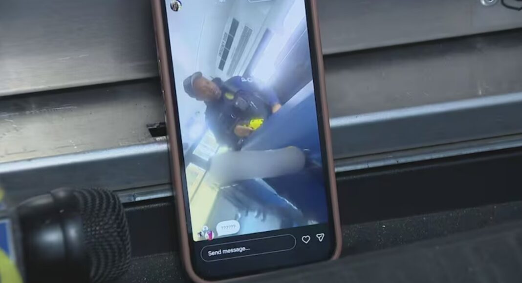 영상에는 한 경찰관이 버스 좌석에 앉아 있는 학생에게 몸을 숙여 테이저건을 발사하는 모습이 담겨 있는 것으로 보인다 .