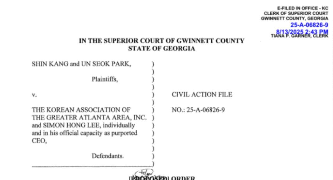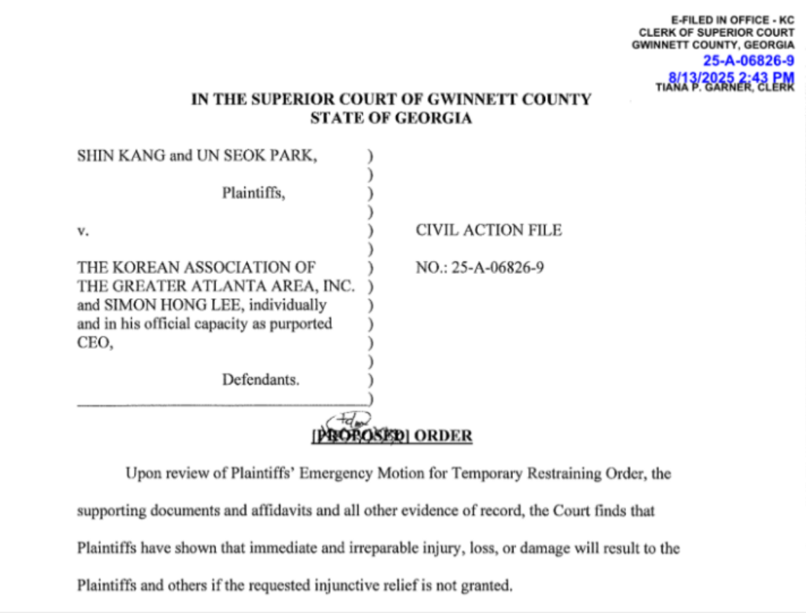 귀넷카운티 상급 법원(Superior Court)이 오는 15일 애틀랜타한인회관에서 열리는 제36대 애틀랜타한인회(회장 박은석)의 광복절 기념행사와 관련해 이홍기씨 측에 행사를 방해 하지말라는 긴급명령을 내렸다.
