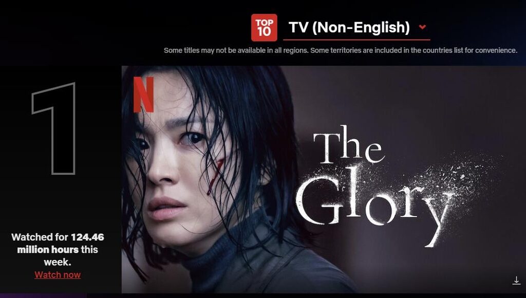 15일 넷플릭스 공식 사이트 ‘넷플릭스 톱(TOP) 10’에 따르면 3월 둘째 주(6∼12일) ‘더 글로리’의 시청 시간은 1억2천446만 시간으로 비영어권 TV 부문 1위에 올랐다.