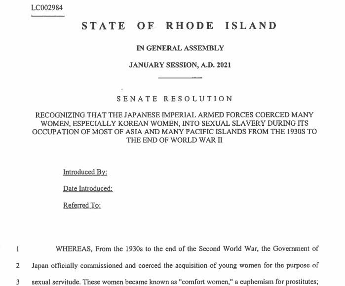 로드아일랜드주 상원은 일본 제국 군대가 1930년대부터 제2차 세계대전이 끝날 때까지 대부분의 아시아와 태평양 섬들을 점령하는 동안 많은 여성, 특히 한국 여성들을 성 노예로 강요했음을 인정한다고 결의했다.