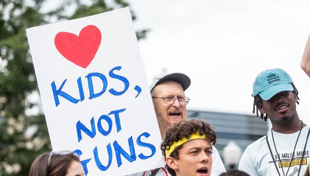 2018년 미국 매사추세츠주(州)에서 벌어진 총기폭력에 반대하는 시위에서 한 참가자가 ‘총이 아니라 아이들을 사랑하라’라고 적힌 팻말을 들고 있다. [게티이미지/AFP=연합뉴스 자료사진]