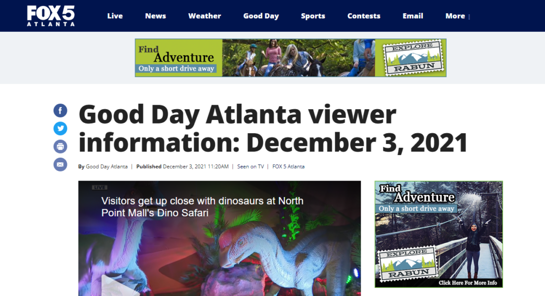 오늘 아침 굿데이 애틀랜타는 지난 11월 알파레타 노스포인트몰에 오픈 한 ‘다이노 사파리: 어 워크 스루 어드벤처(Dino Safari: A Walk Through Adventure)’ 에서 오전을 보냈다 . Imagine Exhibitions(이전에 Good Day Atlanta 에서 방영된 인기 있는 “Downtown Abbey: The Exhibition”의 배후사)가 제작한 이 기간 한정 체험을 통해 방문객들은 시간을 거슬러 올라가서 직접 대면할 수 있습니다. -to-to-teeth!) 실제 크기의 애니마트로닉스 공룡과 함께 이 공룡은 과학적 정확성을 보장하기 위해 고생물학자인 그레고리 M. 에릭슨(Gregory M. Erickson) 박사의 의견으로 만들어졌다고 CEO Tom Zaller가 말했습니다. 거대한 공룡과 함께 사파리는 실제 화석, 인터랙티브 게임 및 발굴 구덩이도 갖추고 있습니다.