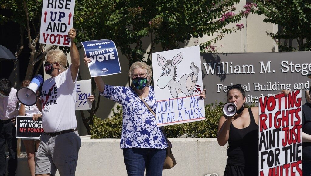 [AP=연합뉴스 자료사진] 미국 텍사스주 타일러에서 주민들이 선거법 개정안에 대한 반대 시위를 벌이고 있다.