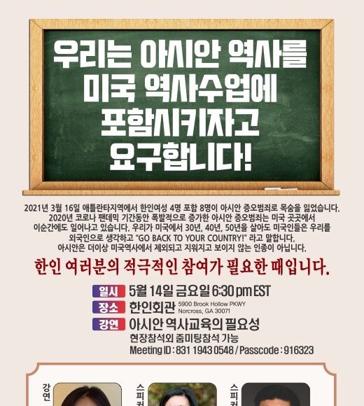 애틀랜타 범 한인 아시안 증오범죄 비상대책위원회(위원장 김백규)는 14일(금) 오후 6시30 한인회관에서 아시안 역사교육의 필요성을 주제로 강연회를 개최한다.