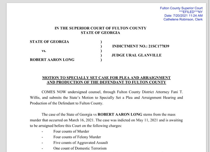 파니 윌리스 풀턴카운티 검찰총장은 21일 AJC와의 인터뷰에서 “예상하고 있었던 일”이라며 지난 19일 풀턴 고등법원 판사인 우랄 글랜빌에게 롱에 대한 기소 일정을 8월 6일이나 그 이전에 잡아달라고 요청했으며, 이를 위해 범인 롱의 수감을 풀턴카운티로 이송해 달라고 요청한 상태”라고 밝혔다. 또, 가중 폭행, 국내 테러, 중죄 집행 중 무기 소지 등 4가지 혐의에 대한 공소장을 대기시켜 달라는 신청서를 제출했다고 말하고 사형과 증오범죄를 함께 구형할 계획이라고 강조했다.