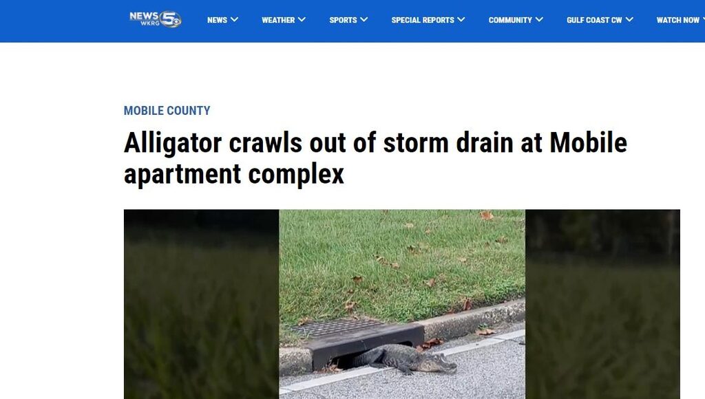 주민 케니샤 밀러 씨와 남자친구 앤서니 패터슨 씨는 현지 WKRG-TV와 인터뷰에서 “차를 몰고 돌아오는 길에 악어가 배수구에서 기어 나오는 것을 보고 깜짝 놀랐다”고 말했다.