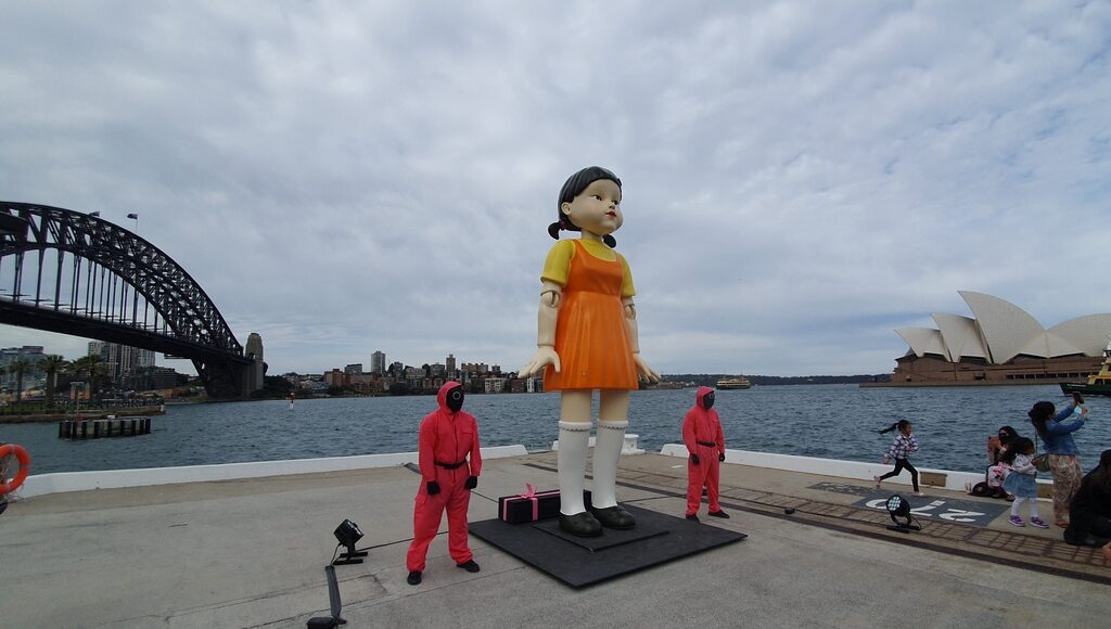 1일 오후(현지시간) 호주 시드니 오페라 하우스와 하버 브리지 사이 서큘러 키에 ‘오징어 게임’ 영희 로봇이 나타났습니다.