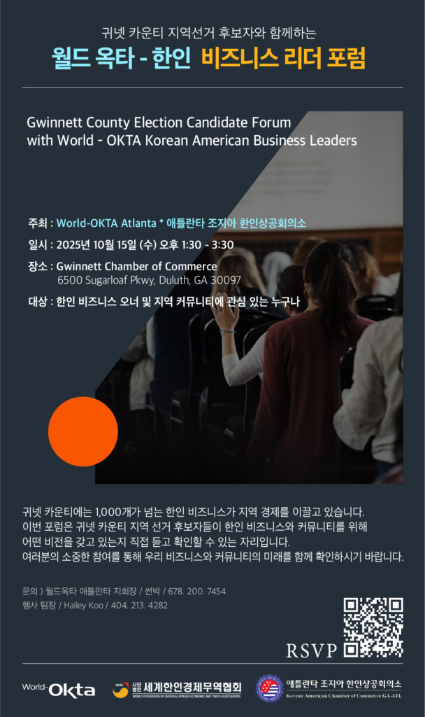 Q&A 형식으로 타운홀 미팅 형식으로 열리는 이 행사는 월드옥타 애틀랜타지회(회장 썬박)과 애틀랜타조지아 한인상공회의소(회장 한오동) 이 공동으로 마련하며, 오는 15일 오후 1시 30분부터 3시 30분까지 귀넷상공회의소 회의장에서 열린다. 한인 비즈니스 오너 및 지역 커뮤니티에 관심있는 사람은 누구나 참석할 수 있다.