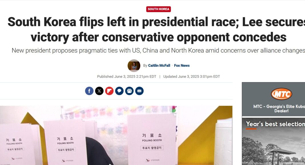 보수 언론 팍스뉴스는 3일 “한국 대선, 좌파로 전향…보수 상대 패배 후 이재명 승리 확정”이라 보도했다.