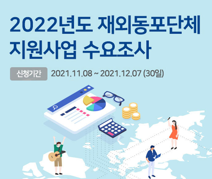 재외동포재단은 ‘2022년도 재외동포단체 지원사업 수요조사’를 실시하고, 재외동포재단이 운영하는 「Korean.net 온라인 지원신청 시스템」을 통해 2021.12.5.(일)까지) 제출할 것을 공지했다.