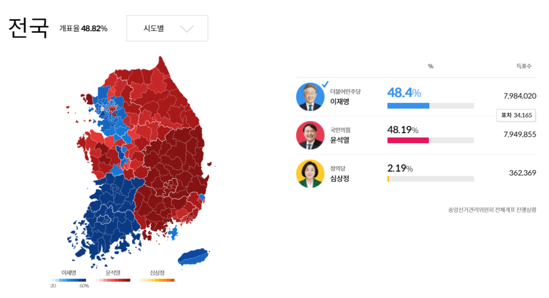 HomeWorld한국초박빙, 0.63%로 표차 좁혀가는 윤석열 뒷심은? 초박빙, 0.63%로 표차 좁혀가는 윤석열 뒷심은? 03/09/2022 By K News Atlanta 개표율 48.82%로 절반에 가까와지자 이재명 후보와 윤석열 후보가 초박빙 경합을 벌이고 있다. 더불어 민주당 이재명 후보는 48.4%, 국민의힘당 윤석열 후보는 48.19 %의 득표율로 표차수는 3만4165표로 나타났다. 관련된 글: “다자대결서 윤석열 40.6% 이재명 36.7% 안철수 12.9%” 리얼미터 조사 “尹 6.5%p↑,李 3.4%p↓, 安 1.8%p↑” 野단일화시 “尹 45.2%... 윤석열 제20대 대통령 당선…’87년 체제’ 첫 5년만의 정권교체(종합) 보수-진보 결집에 초박빙 혈투…헌정사 최소 득표차 0.8%p 이념·세대·젠더 갈등까지 증폭…’협치·통합’... 결선 투표에 에이브람스 입김 쎘다? 투표 결과 총정리 화요일 결선투표에서 에이브람스 지지 민주당 주무장관·법무장관.노동국장 후보들 승리 공화당 결선에선... ‘윤석열 40% > 이재명 31%’ 격차 벌어진 조사에… 민주 “단일화 문항 탓, 李 지지층 조사 도중 이탈해 결과... 03/09/2022 By K News Atlanta Share Kakao StoryFacebookTelegramTwitterNaverEmailCopy URL Previous article30% 개표에 이재명 49.63%, 윤석열 47.08%…격차 좁혀Next article윤석열 역전 48.41%, 이 48.16% Tags0.63%표차윤석열좁혀가는초박빙 뉴스 더보기 사고팔고/구인 구직 [구인/구직] 간병인 선생님 10/29/2025 미국 22기 평통, 운영위원 김형률. 애틀랜타협의회장에 이경철 씨 임명 10/29/2025 애틀랜타 [속보] 조지아에 이어 전미주 뷰티협도 통합 10/27/2025 기고 [이상운 ‘시’] 바보 칠푼이 10/27/2025 Biz 한인 상의, 스타트업 지원금 마련 골프대회 우천으로 연기 10/27/2025 Biz [속보] 두 개 뷰티협회, 하나로 대 통합 10/24/2025 애틀랜타 한인회, ‘건강 걷기 대회’ 열며 동포들과 소통의 자리 마련 10/20/2025 애틀랜타 애틀랜타 공항, 연방정부 폐쇄로 인력 부족 – “일찍 도착” 당부 10/20/2025 Biz 월드옥타. 한인 상의, 미 정치 후보들과 소통 10/20/2025 Biz 미국 목재 대기업 2곳, 합병해 애틀랜타로 본사 이전 계획 10/15/2025 공연.전시 “한복 하세요!” 16일, 애틀랜타 공항서 한복의 날 기념행사 열린다 10/15/2025 스포츠 한인상의, ‘비즈니스 스타트업 골프대회’ 22일 등록 마감 10/15/2025 기획 기획 조지아주 핸콕카운티, 어린이 절반이 굶고 있다. 10/08/2025 My Youtube [영상] B1, ESTA는 원래 그런것! 이민국 체포에 더 확실한 비자 필요 10/01/2025 기획 [돈과 관세] 한국, 미국에 3천500억달러 투자… 관세 25%→15% 합의 07/30/2025 부동산 People 애틀랜타 부동산 전설의 재벌 탐 커즌스 별세, 향년 93세 07/29/2025 기획 메트로 애틀랜타, 구매자 시장으로 변모 중 07/19/2025 부동산 조지아주 전역 연방 사무실 임대료, 대폭 삭감 07/14/2025 Opinion 기고 [이상운 ‘시’] 바보 칠푼이 10/27/2025 기고 [이상운 “시”] 같이 가십시다 10/10/2025 기고 [시] 불광불급(不狂不及) – 운산 홍재호 10/01/2025 English English Sean Park, pronounces Candidacy of Korean Association President 05/08/2025 English “집 사면 달걀 드려요”… 이색광고 낸 테네시 주택 화제 04/15/2025 English Report of loss of nationality for those born with multiple nationalities in 2007, no-reservation visit 02/18/2025 기획 기획 조지아주 핸콕카운티, 어린이 절반이 굶고 있다. 10/08/2025 My Youtube [영상] B1, ESTA는 원래 그런것! 이민국 체포에 더 확실한 비자 필요 10/01/2025 기획 [돈과 관세] 한국, 미국에 3천500억달러 투자… 관세 25%→15% 합의 07/30/2025 People [초대석] 광복 80주년 맞아 이순신 장군 ‘사즉생’ 오케스트라 곡으로, 작곡가 케네스 박 08/20/2025 [초대석] “꿈은 이루어지다” 아마추어 작곡가에서 오케스트라 무대에 오른 80세 작곡가 정래열 씨 08/19/2025 Load more 종교 애틀랜타 교회협, 복음화 대성회 2차 준비 기도회 열려 10/06/2025 애틀랜타 복음화 대성회 2차 기도회, 2일 프라미스교회에서 10/01/2025 Biz [영상] 조지아 뷰티 트레이드 페스티발 대성황 K News Atlanta - 10/07/2025 My Youtube [영상] B1, ESTA는 원래 그런것! 이민국 체포에 더 확실한 비자 필요 K News Atlanta - 10/01/2025 My Youtube “감동, 웅장한 울림” 광복80주년 통일기원 대음악회 K News Atlanta - 09/13/2025 My Youtube 한인 청소년들, 이탈리아 오카리나 국제 콩쿨 참가 K News Atlanta - 08/06/2025 My Youtube [영상] 민주당 미쉘 강 후보, 후원의 밤 행사 열어 K News Atlanta - 08/04/2025 crossorigin="anonymous">