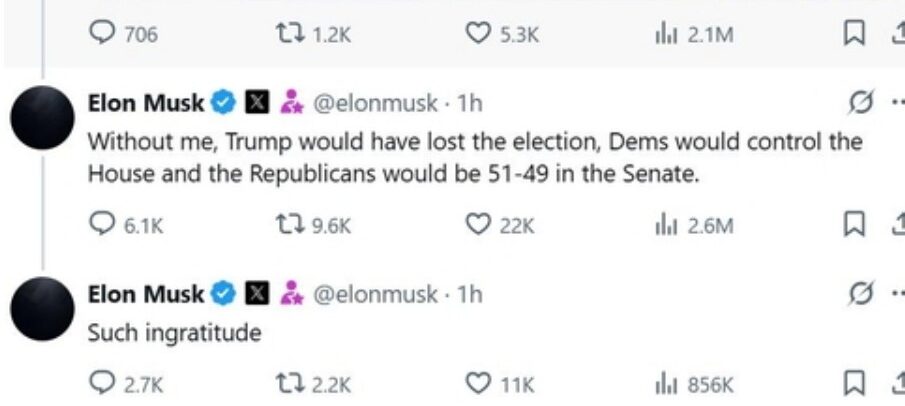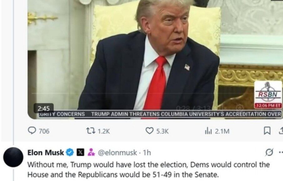 머스크는 지난 대선 당시 자신의 도움 없이도 경합주인 펜실베이니아에서 승리할 수 있었다는 트럼프 대통령의 말에도 발끈하며 해당 발언 영상에 “내가 없었으면 트럼프는 선거에서 졌을 것이고, 민주당은 하원을 장악했을 것이며, 공화당은 상원에서 51대 49가 됐을 것”이라고 답글을 달았다.