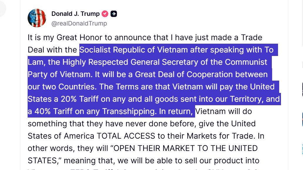 트럼프 대통령은 “이번 협정으로 베트남은 미국에 우리 영토로 수입되는 모든 상품에 대해 20%의 관세를, 모든 환적에 대해 40%의 관세를 지불한다”면서 “베트남은 미국에 시장을 개방하고, 우리는 베트남에 관세 없이 제품을 판매할 수 있게 될 것”이라고 밝혔다.