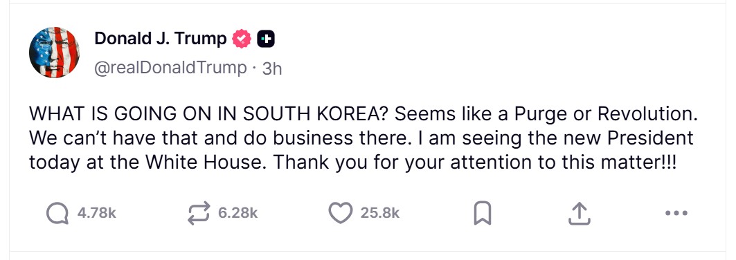 트럼프 대통령은 이날 사회관계망서비스(SNS) 트루스소셜에 올린 글에서 “한국 에서 무슨 일이 일어나고 있는 것인가”라며 “숙청 또는 혁명같이 보인다”고 썼다. 또 “우리는 그것을 수용할 수 없고, 거기서 사업할 수 없다”고 덧붙였다.