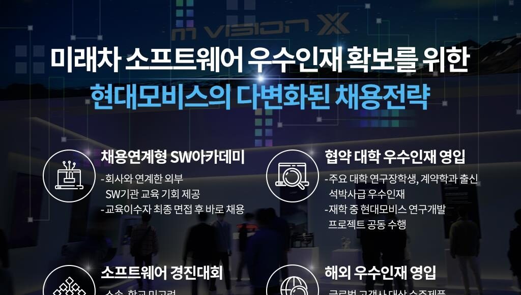 구체적으로 미래차 핵심부품 개발을 위해 협약을 맺은 주요 대학의 연구 장학생 또는 계약학과 출신 석·박사급 우수 인재 영입, SW 경진대회 개최를 통한 우수 입상자 채용, 해외 우수 인재 영입 등이다.