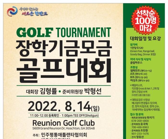 민주평화통일자문회의 애틀랜타협의회(회장 김형률)는 오는 8월 14일 오후 1시 호쉬톤 소재 리유니온 골프클럽(5609 Grand Reunion Dr, Hoschton, GA30548)에서 ‘장학기금 모금 골프대회’ 를 마련한다.