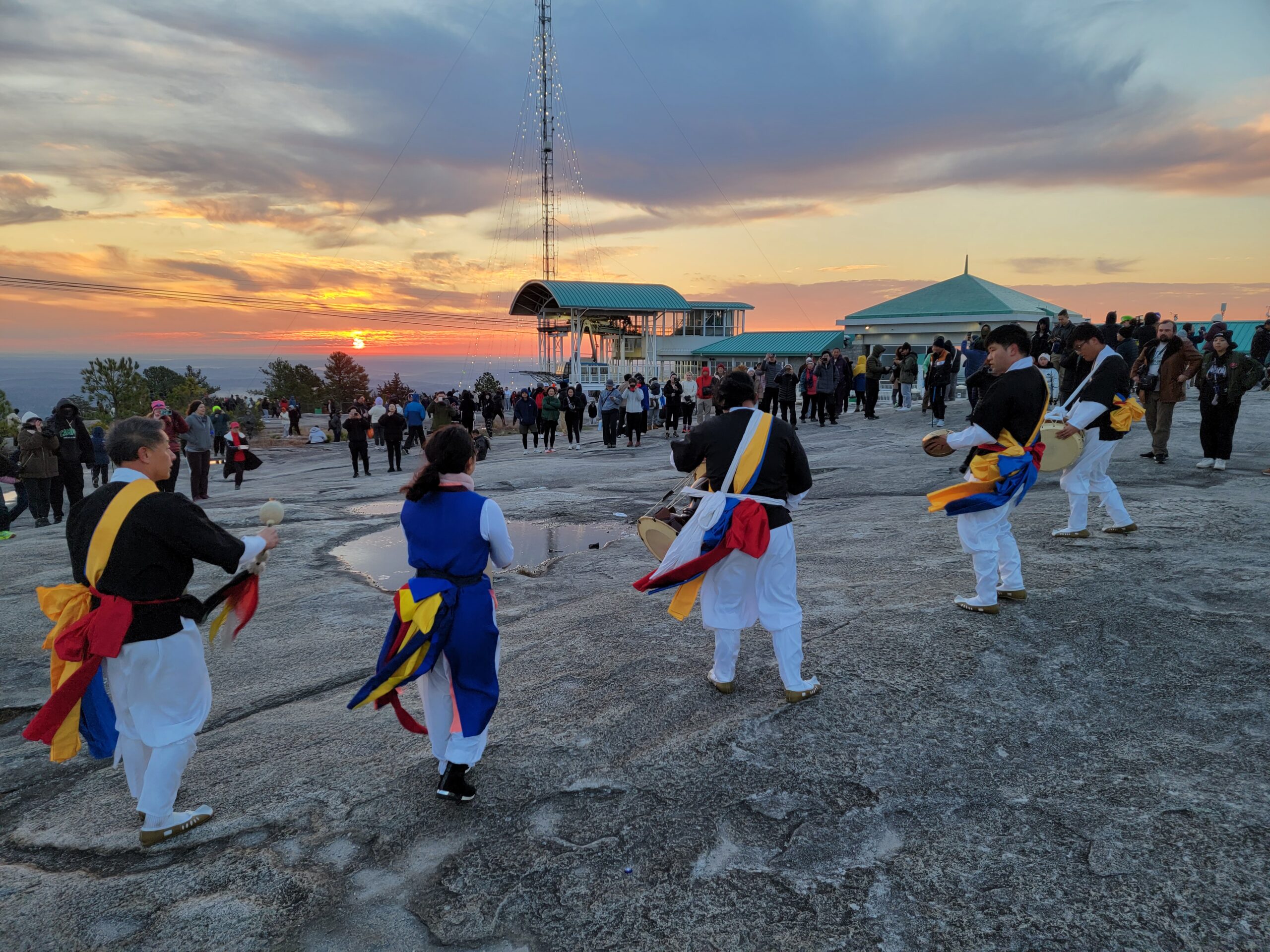 산 정상에서 한국문화원 김봉수 풍물놀이팀의 흥겨운 놀이 마당과 한국 무용가 한희주씨의 춤사위가 펼쳐졌다.