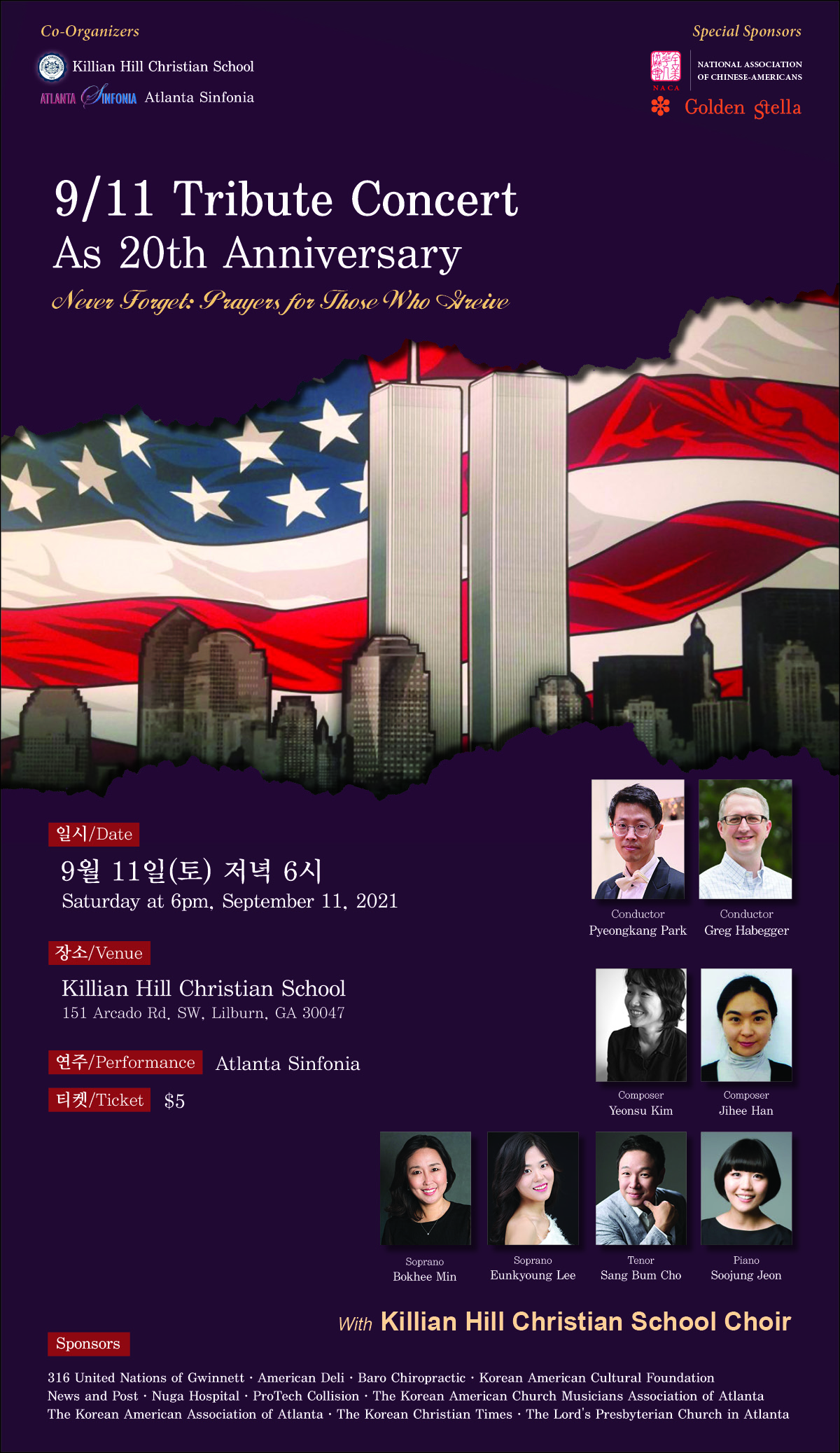 애틀랜타 신포니아(음악감독/지휘: 박평강)과 킬리안 힐 크리스찬 학교가 911 테러 20주기 헌정 음악회를 마련한다.