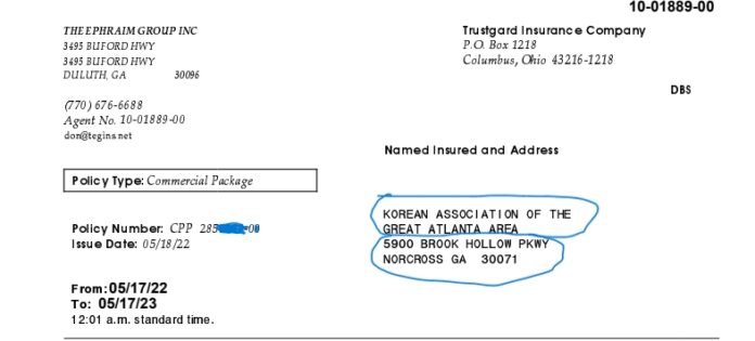 애틀랜타 한인회가 올해 5월17일 새로 든 보험. 여전히 한인회 명칭이 잘못되어 있으며, 한인회 관계자가 이 보험에 대해 인지하지못해 부실 행정을 드러냈다./에이전트 제공