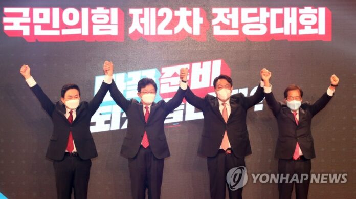 손 맞잡아 들고 인사하는 국민의힘 대선 경선 후보들(서울=연합뉴스) 국민의힘 원희룡(왼쪽부터), 유승민, 윤석열, 홍준표 대선 경선 후보가 5일 오후 서울 용산구 백범김구기념관에서 열린 국민의힘 제2차 전당대회에서 손을 맞잡아 들고 참석자들에게 인사하고 있다. 2021.11.5 [국회사진기자단
