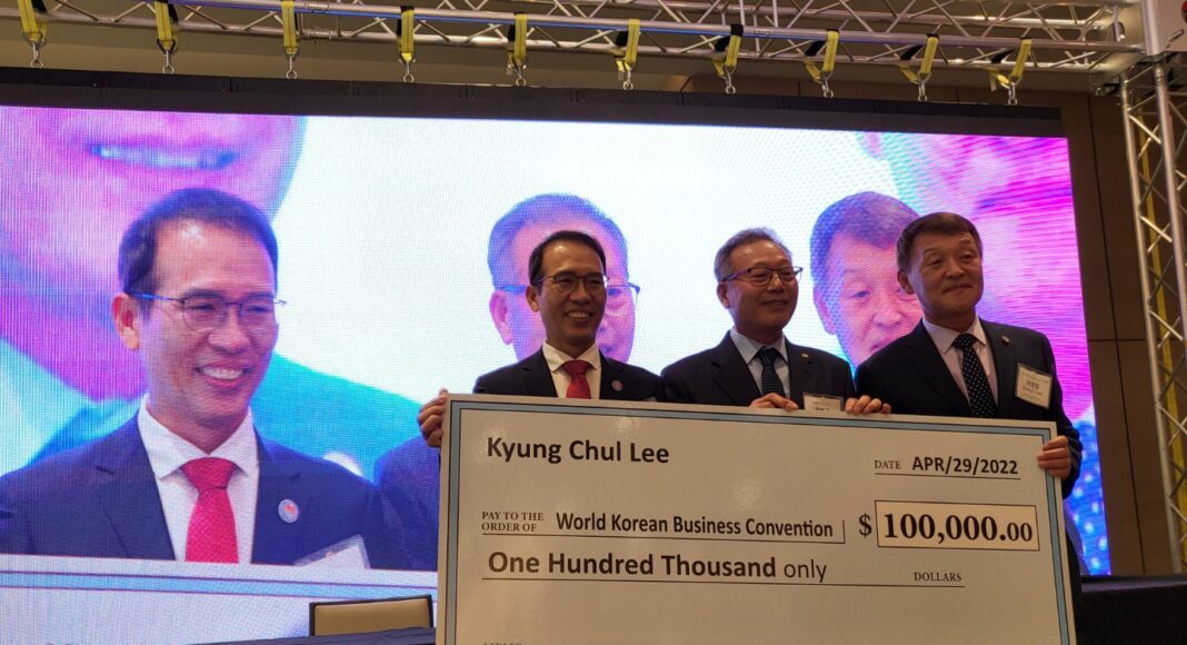 이경철 미주한인상공회의소 총연합회 정무 수석부회장이 내년 가을 캘리포니아 오렌지카운티에서 열리는 제21차 세계한상대회를 위해 총 10만 1달러($100,001)의 후원금을 전달했다.